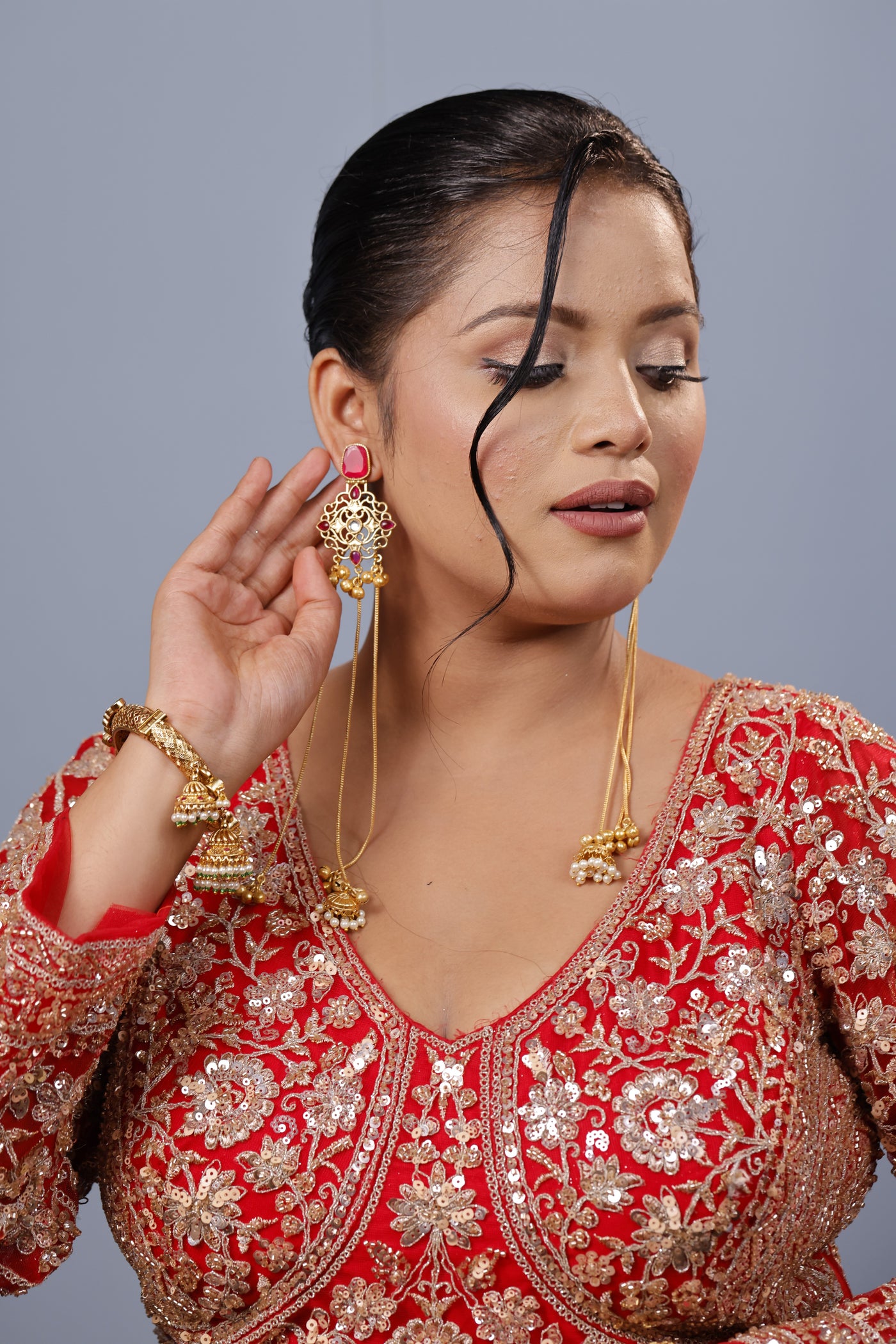 Ruby Long Chain Gold-Plated Jhumka Earrings