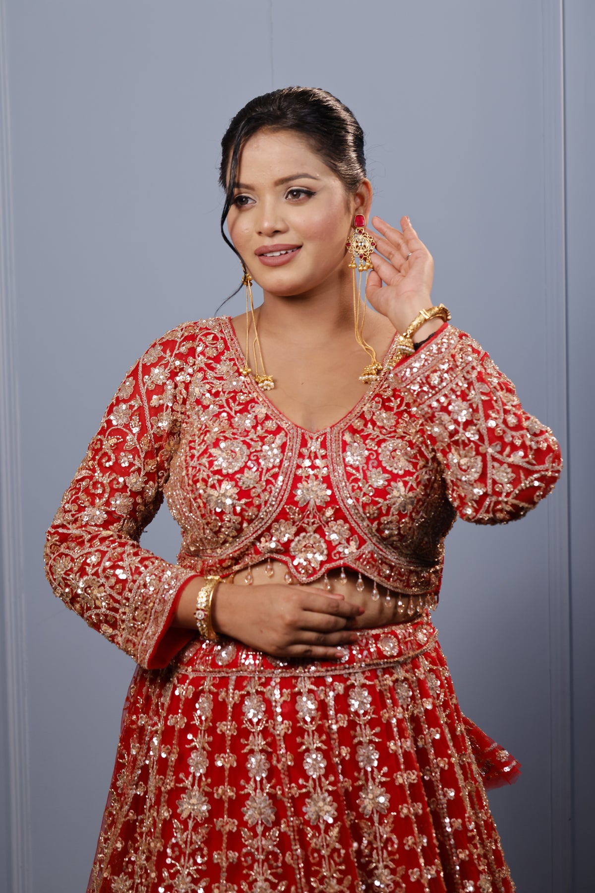 Elegant gold-plated long jhumka earrings featuring ruby-red stones, delicate floral motifs, and pearl drops. Perfect for weddings, parties, and festive occasions, adding a royal touch to your ethnic attire.