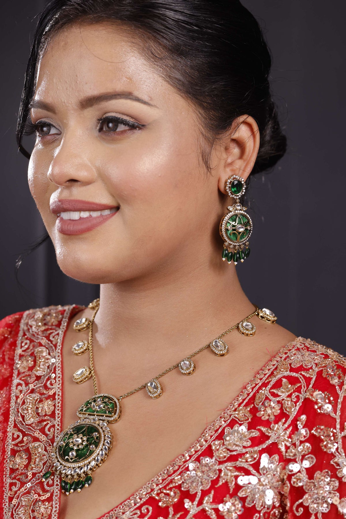 Turn heads effortlessly with our Jadau Emerald Set With Hanging Earrings. Designed to elevate your everyday look, this piece blends bold style with modern elegance. Perfect for brunches, parties, or just adding sparkle to your vibe — it’s that one accessory you’ll keep reaching for!
